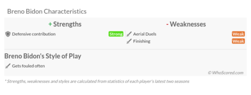 ビドンの強みとしてはディフェンスの貢献。そして、弱みは空中戦とフィニッシュ。whoscoredの特徴としてはファウル受けがちという評価をされています。