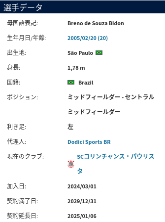ブレノ・ビドンは2005年生まれで現在20歳のブラジル人選手。コリンチャンスのアカデミーで育った後、2024年からトップチームに所属し、将来のブラジル代表でも中盤を担う選手と評判の選手だそう。