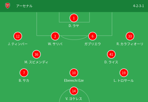 中盤はアンカーにスビメンディ、その前にライス、エゼ。前線は左にトロサール、右にサカ、トップにはヨケレスが入った。