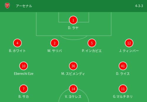 中盤はアンカーにスビメンディ、その前にライス、エゼ。前線は右にサカ、左にマルティネリ、トップにはヨケレスが入った。