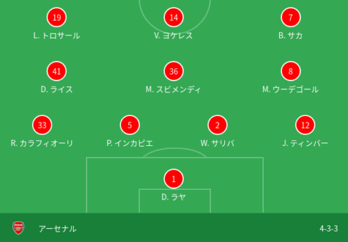中盤はアンカーにスビメンディ、その前にライス、ウーデゴール。前線は右にサカ、左にトロサール、トップにはヨケレスが入った。